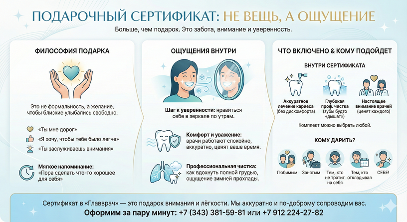 И именно поэтому подарочный сертификат на лечение кариеса или профессиональную чистку зубов в клинике «Главврач» стал одним из самых лучших зимних подарков. Это не аксессуар, не безделушка. Это подарок, в котором слышно: